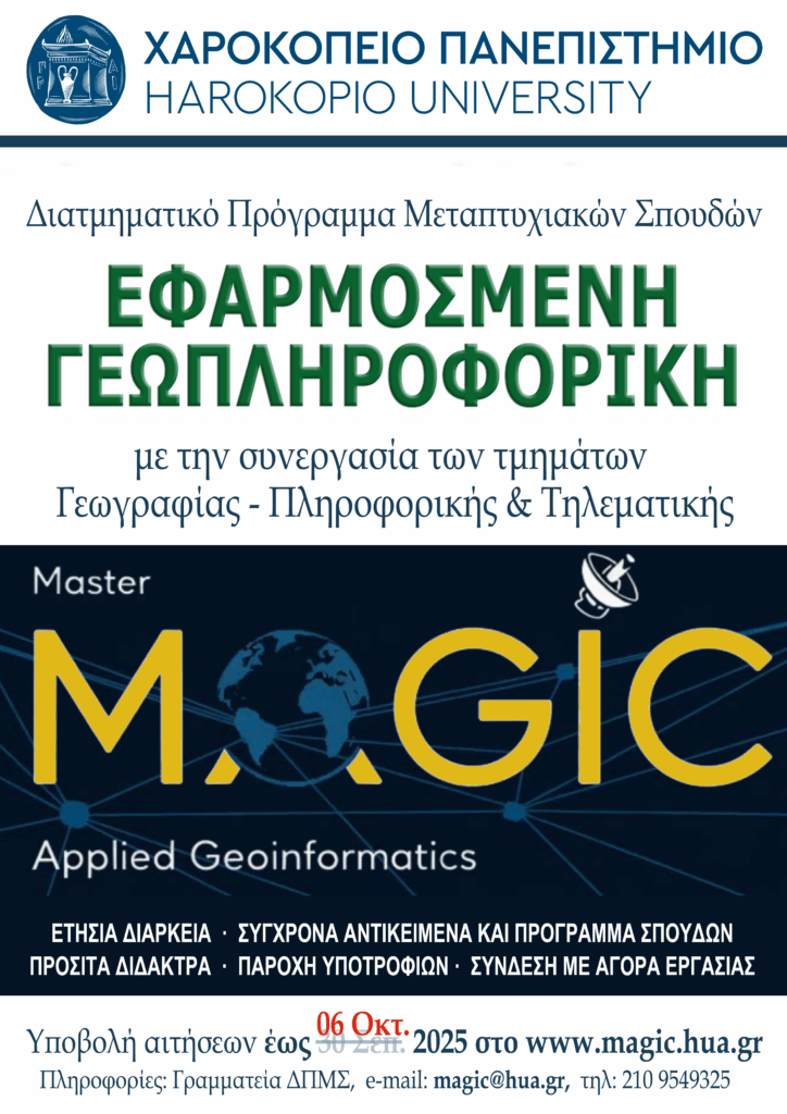 Το Χαροκόπειο Πανεπιστήμιο εγκαινιάζει το νέο Διατμηματικό Πρόγραμμα Μεταπτυχιακών Σπουδών «Εφαρμοσμένη Γεωπληροφορική», ή αλλιώς MAGIC – Master of Applied GeoInformatiCs. Το πρόγραμμα σχεδιάστηκε και υλοποιείται από το Τμήμα Γεωγραφίας σε συνεργασία με το Τμήμα Πληροφορικής και Τηλεματικής, στη βάση 17 ετών ακαδημαϊκής εμπειρίας, με στόχο τη δημιουργία ενός μεταπτυχιακού που συνδυάζει τη γεωχωρική σκέψη με την τεχνολογική καινοτομία.